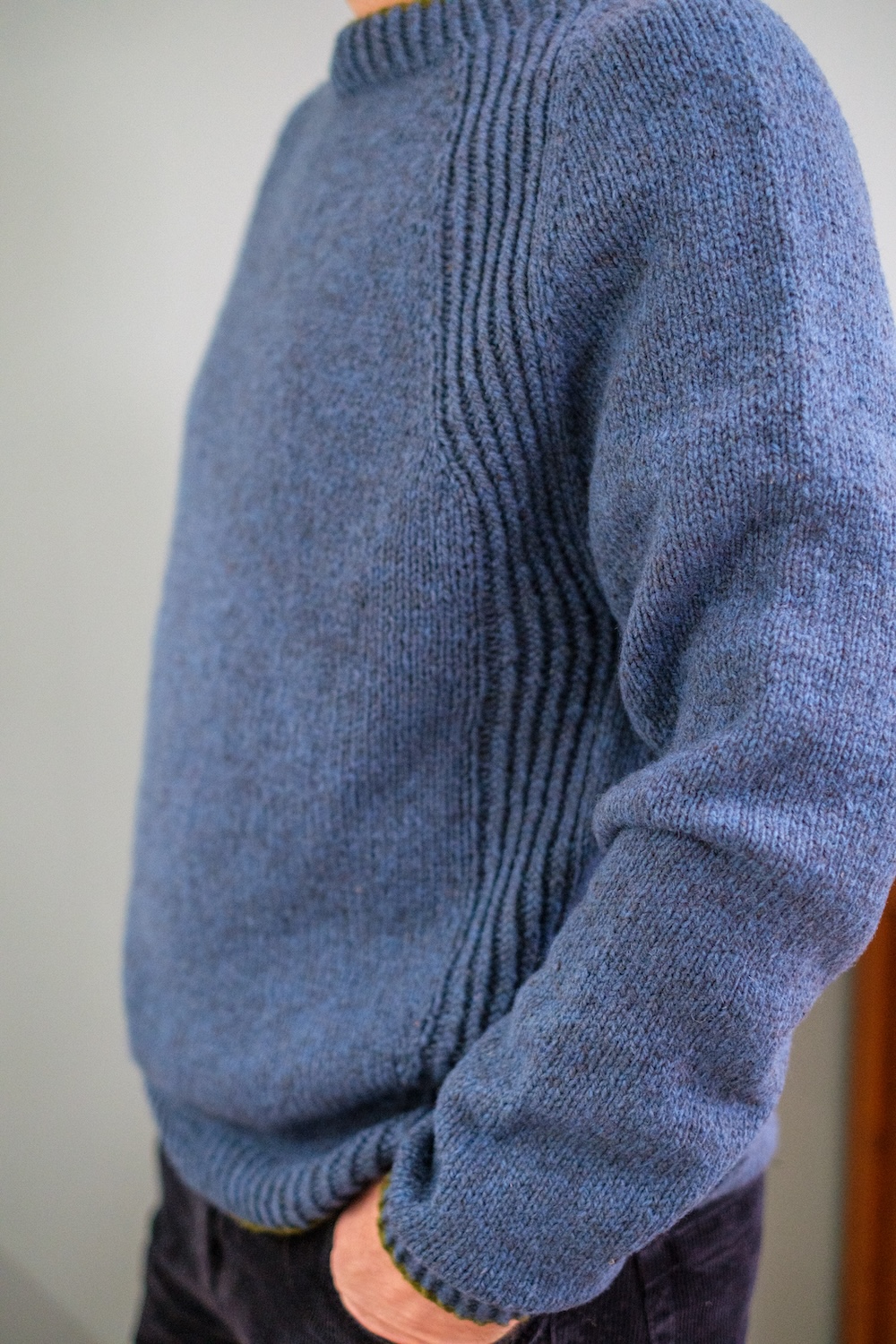 Opcional: en la versión de hombre hice el montaje del cuello y las 2 primeras vueltas en un color de contraste. También las 2 últimas vueltas y el cierre del cuerpo y los puños.