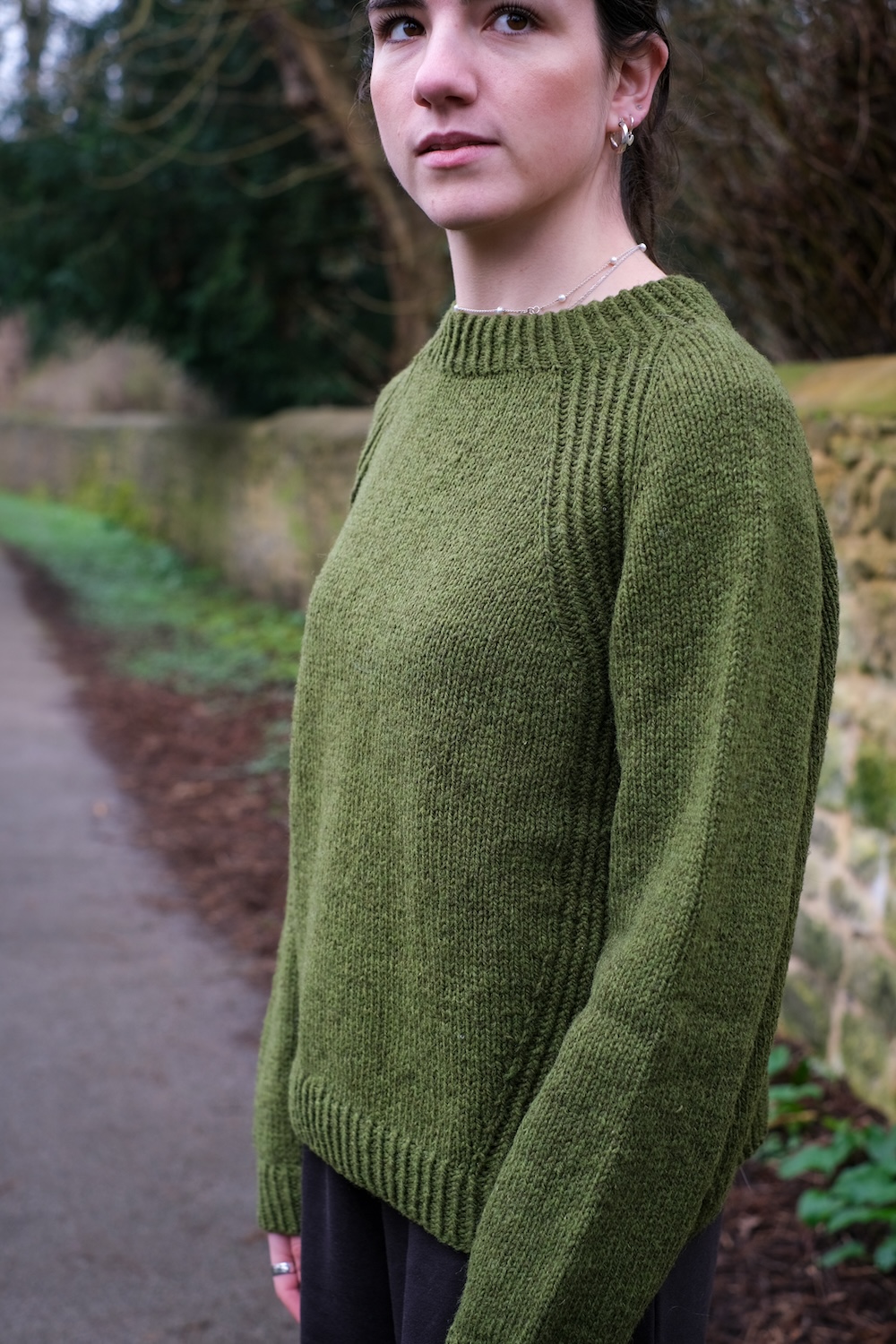 El Caleya es un jersey que se teje de arriba abajo en circular, sin costuras. Tiene una construcción tradicional de manga raglán y las «costuras» del raglán del delantero están formadas por unos paneles de punto elástico retorcido que bajan por todo el cuerpo, girando gradualmente hacia el centro del delantero. El patrón viene con 9 tallas de hombre y 9 tallas de mujer. Una «caleya» en asturiano es un callejuela estrecha en un pueblo.