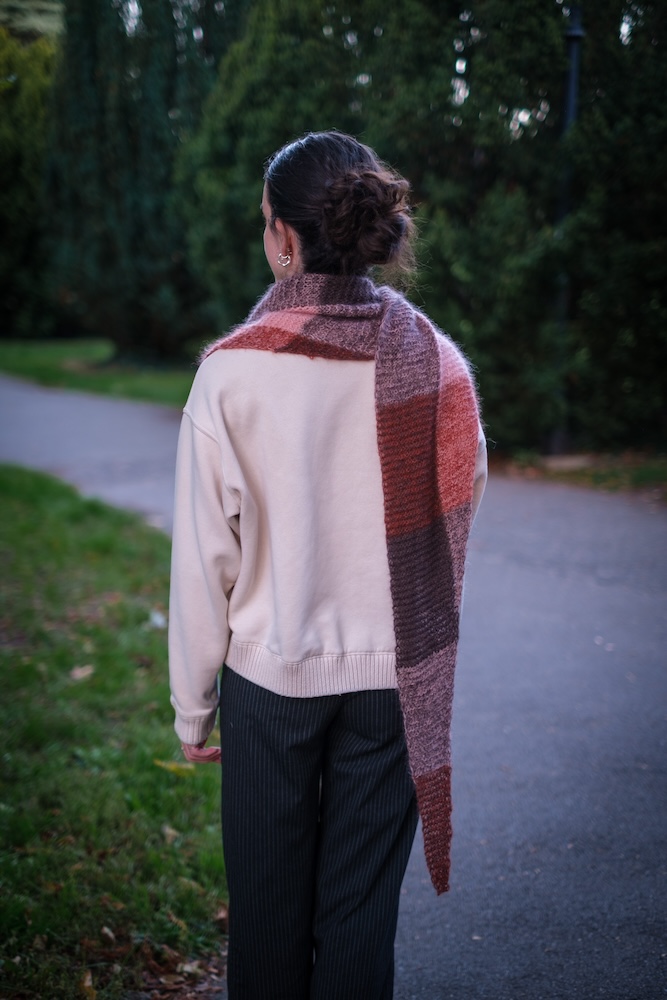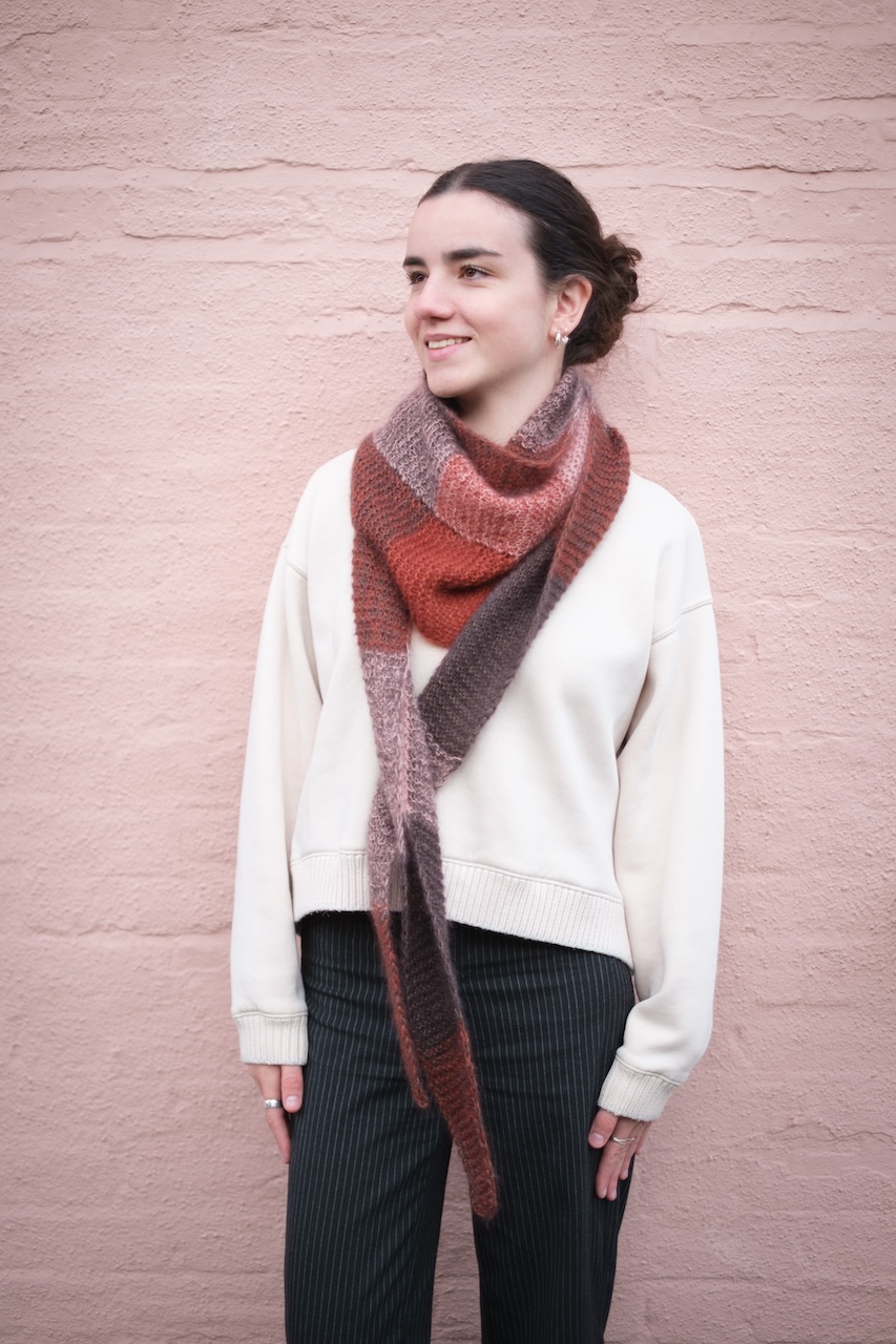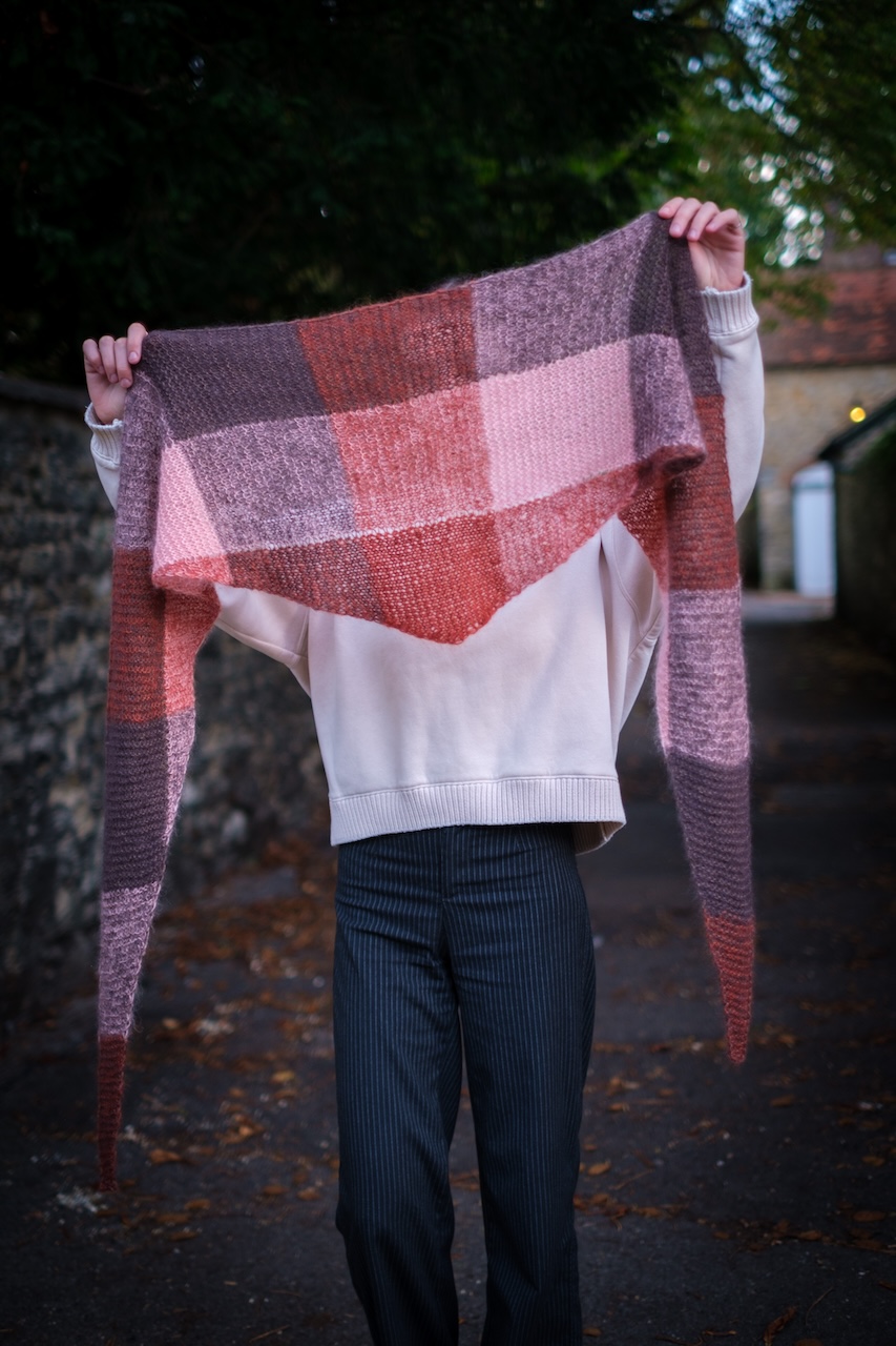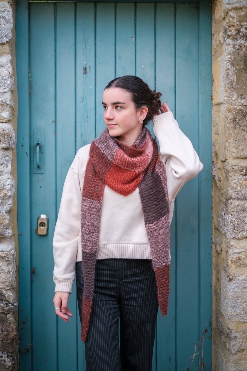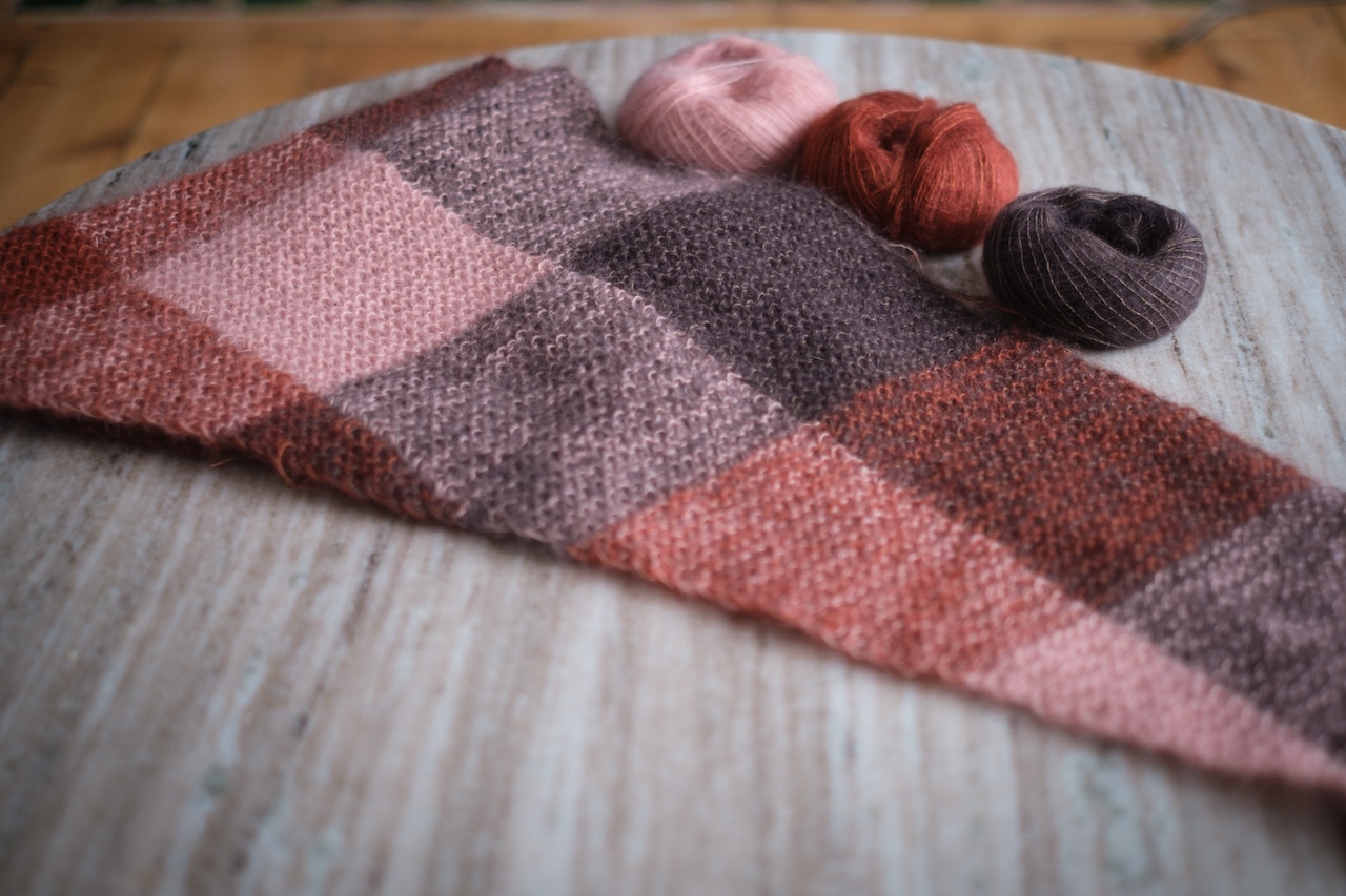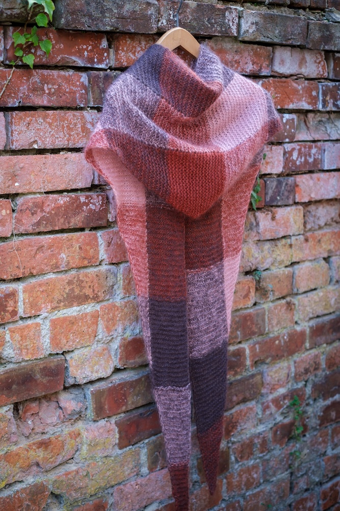 El chal Llosa es un chal sencillo de forma triangular. Se empieza por una punta, se va aumentando gradualmente hasta llegar a la mitad del chal y, a partir de ahí, se empiezan las disminuciones hasta llegar a la otra punta. En este chal jugamos con los colores para formar cuadrados. Se tejen dos hebras juntas y se cambia el color de una de ellas cada cierto número de puntos o cierto número de vueltas, resultando en cuadrados de diferentes tonos y un chal muy fácil y entretenido de tejer.