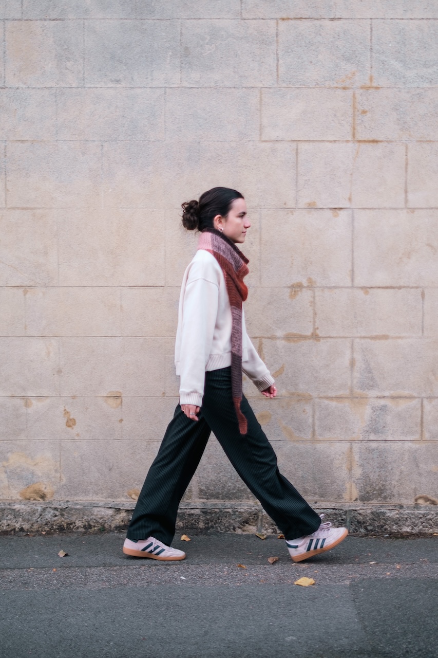 2 hebras de grosor Lace juntas. Yo usé De Rerum Natura Bérénice (55% mohair, 25% seda, 20% merino). Al tejer con agujas de 6 mm puedes combinar varios grosores: lace + fingering, 2 fingering, fingering + sport, lace + sport, 2 sport, etc. pero los colores se mezclan más sutilmente cuando usas una lana con pelo, como el mohair, la alpaca, etc.